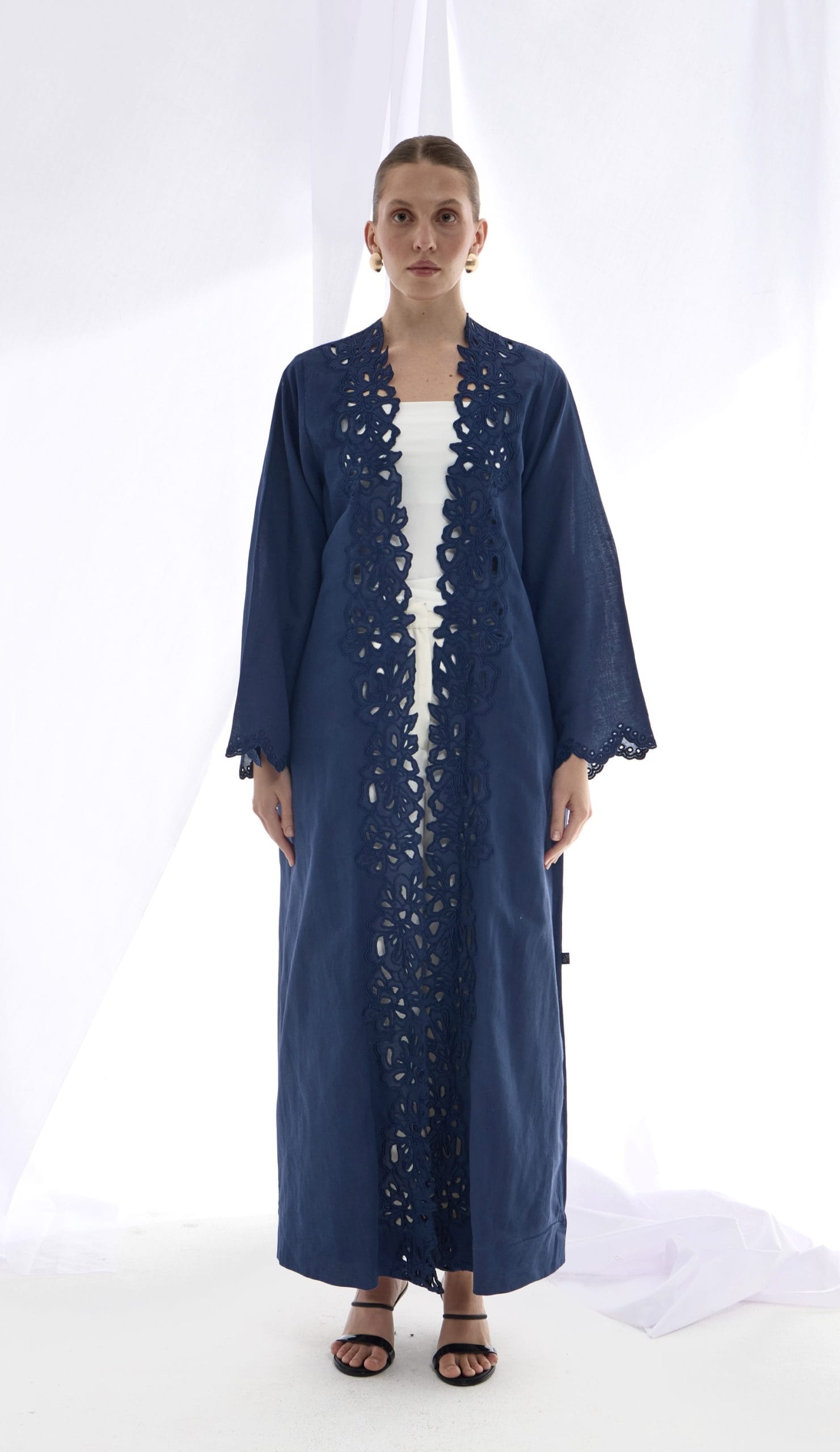 Crafted from pure linen, This A cut abaya is adorned with delicate cut-out embroidery that blooms like endless flowers, finished with a soft cotton lining, giving it a graceful blend of comfort and artistry.