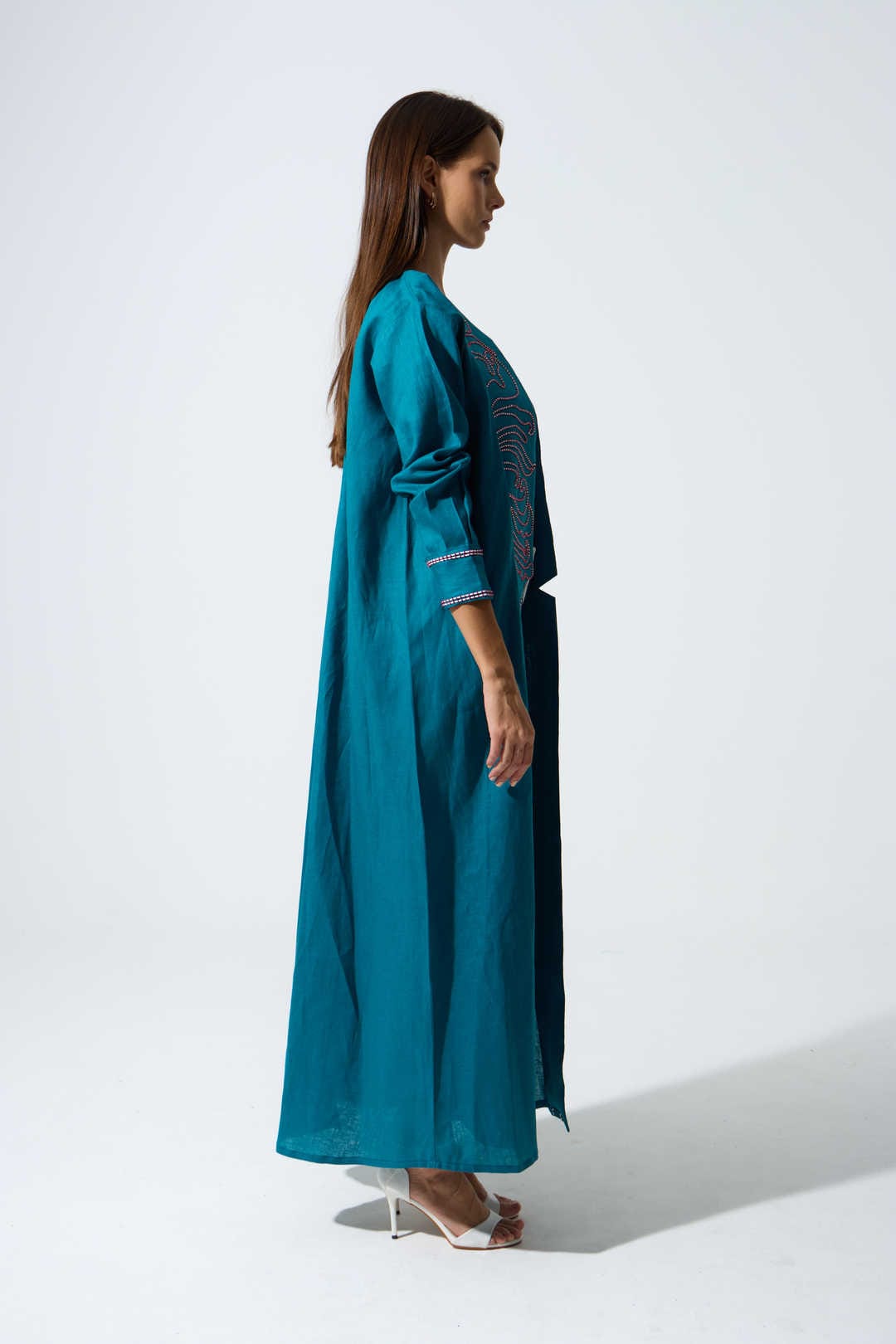 This elegant A-Cut Abaya is made from Pure premium European Linen which combines a classic design with sophisticated details. Adorned with contrasting hand embroidered pattern, the design features an overlapping collar with a bottom slit in the back, creating a graceful yet structured silhouette. Paired with a matching color chiffon sheila.