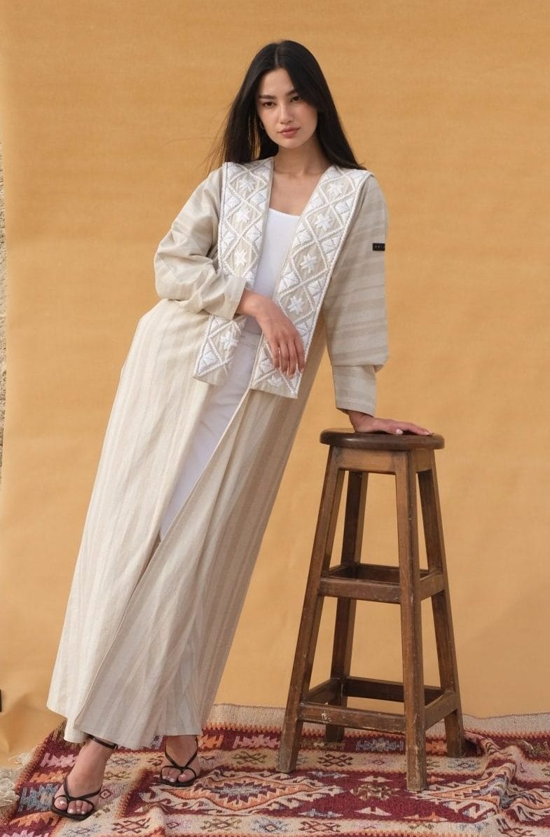 Textured A cut beige linen abaya with collar and handmade off white embroidery. Comes with a beige veil. Model is wearing Medium.