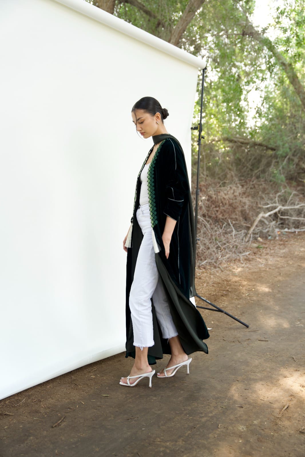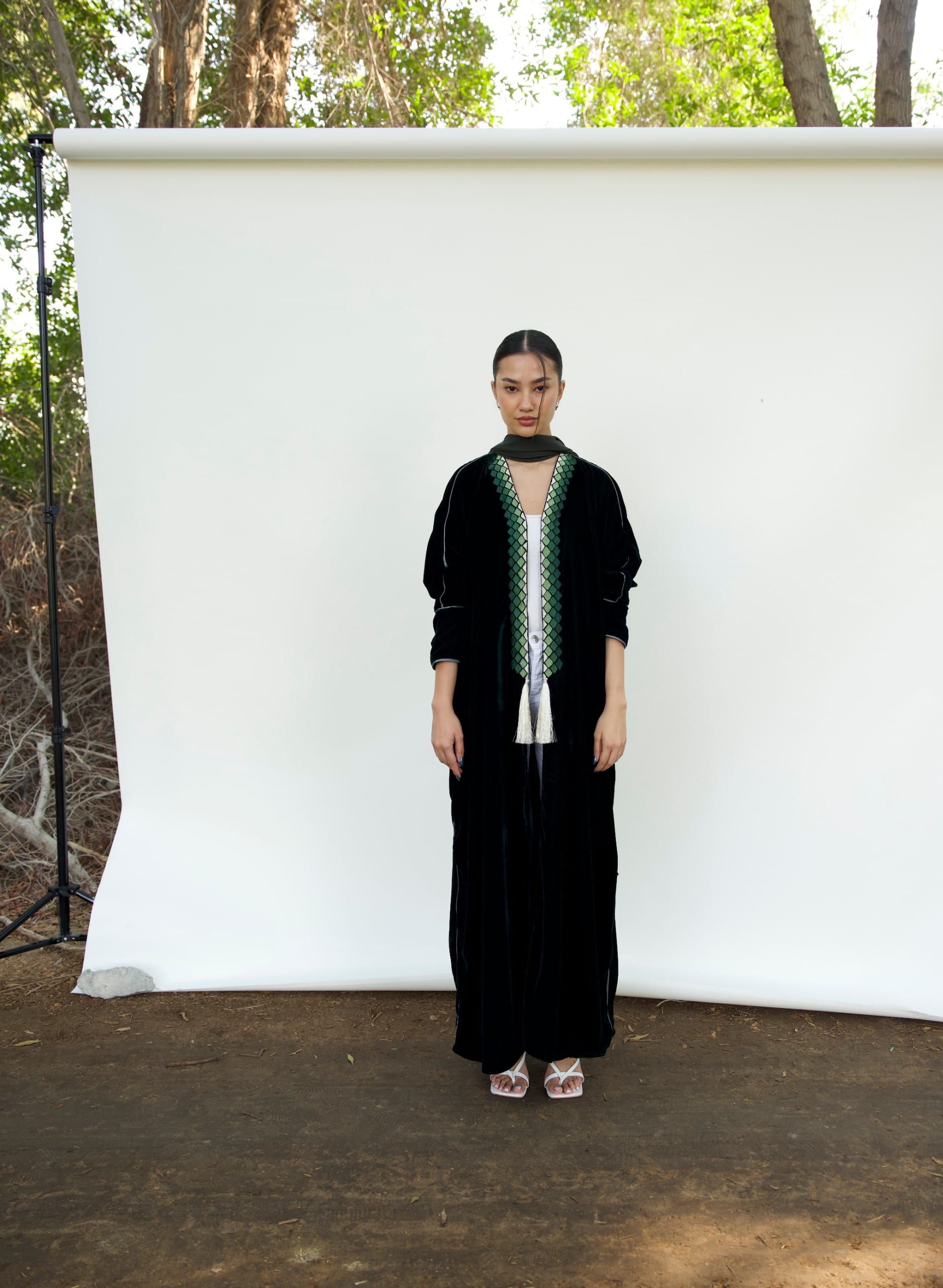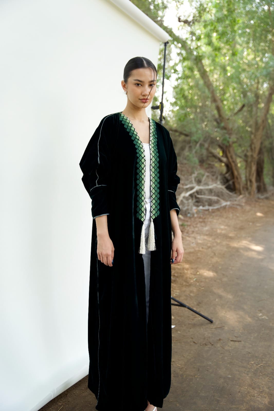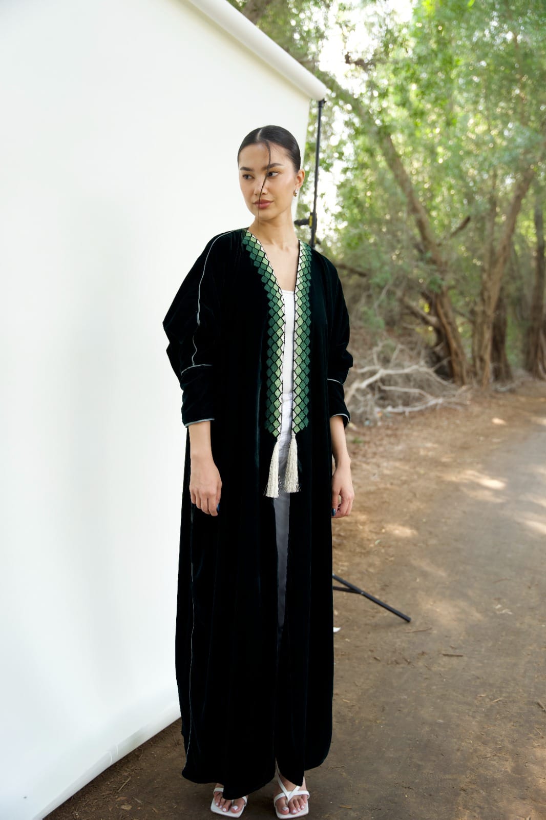 This Bisht silhouette Abaya is crafted from Luxurious Velvet that gently shimmers under the light, featuring beautiful intricate mosaic-like pattern embroidery and Finished with a pearl-Thread tassel.