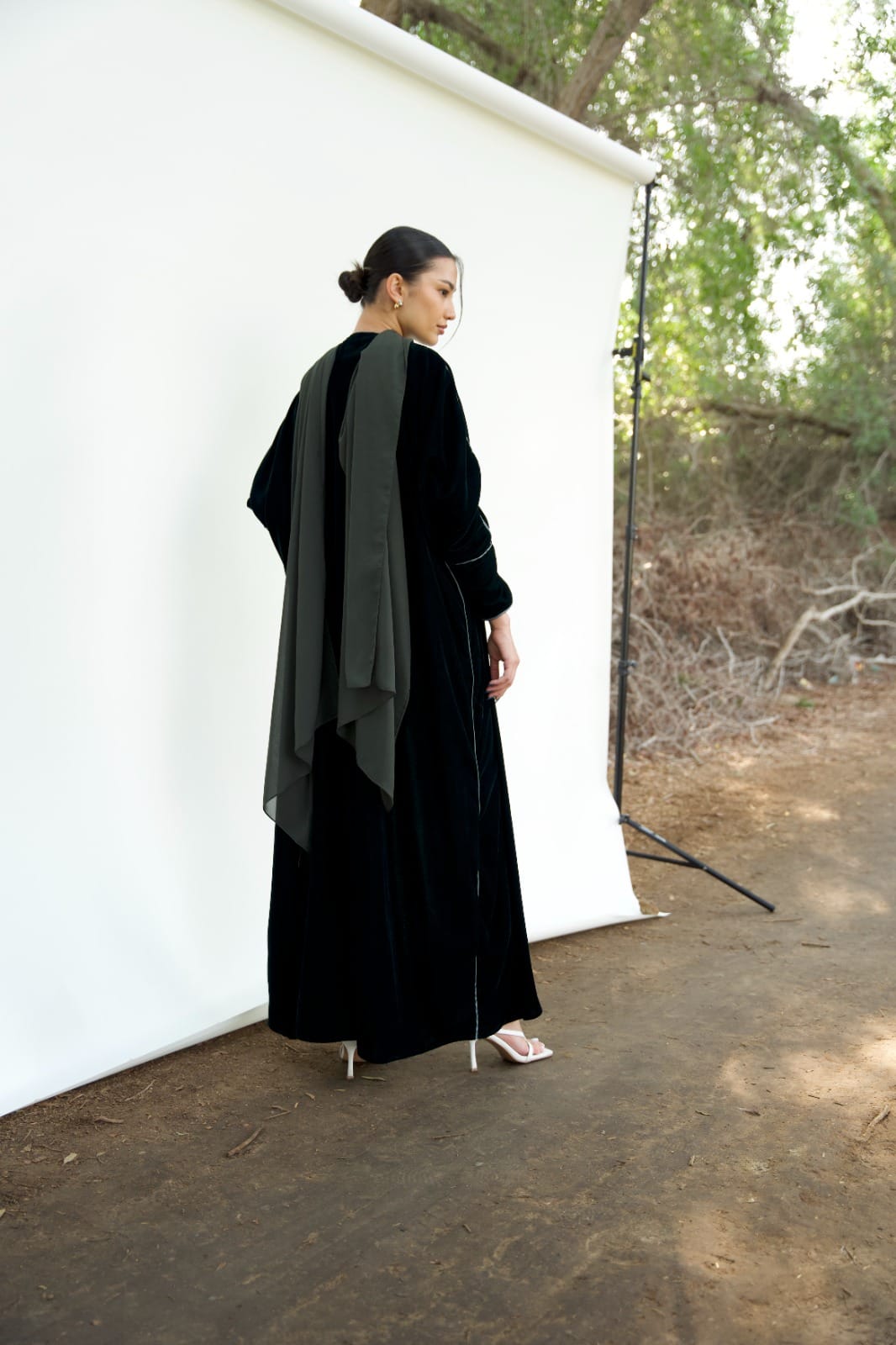 Privilege’s new-season set showcases the artistic detailing that the brand is known for.   This Bisht silhouette Abaya is crafted from Luxurious Velvet that gently shimmers under the light, featuring beautiful intricate mosaic-like pattern embroidery and Finished with a pearl-Thread tassel.  Tailored with a contrasting Chiffon lining and a sheila to complete the look.  Model is…