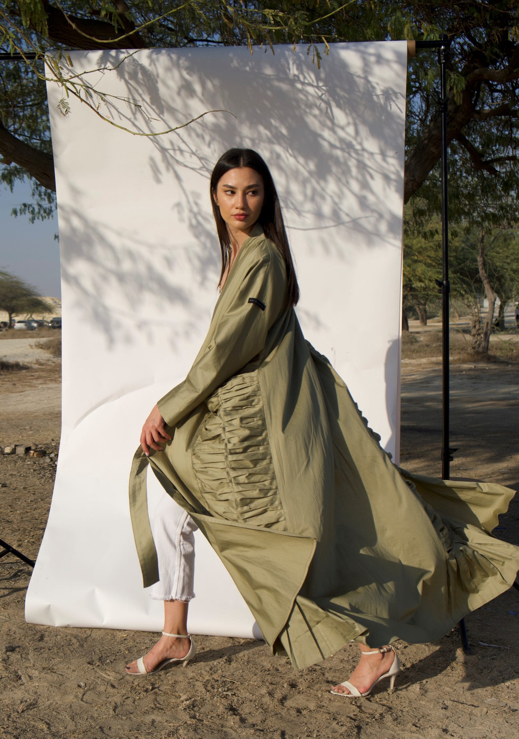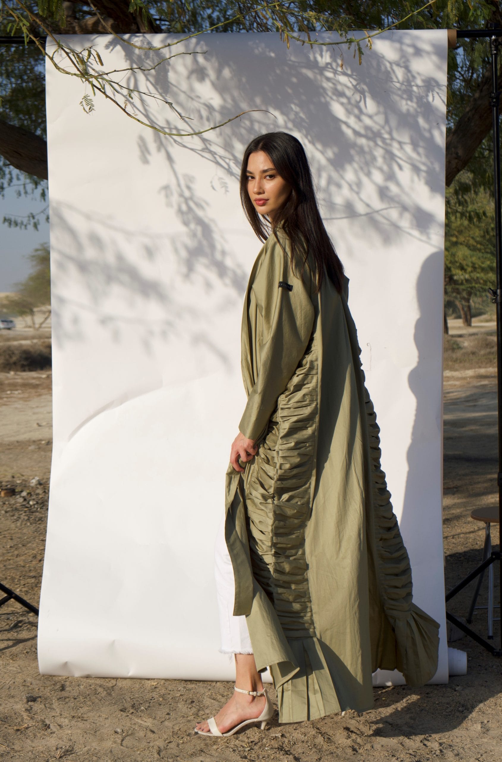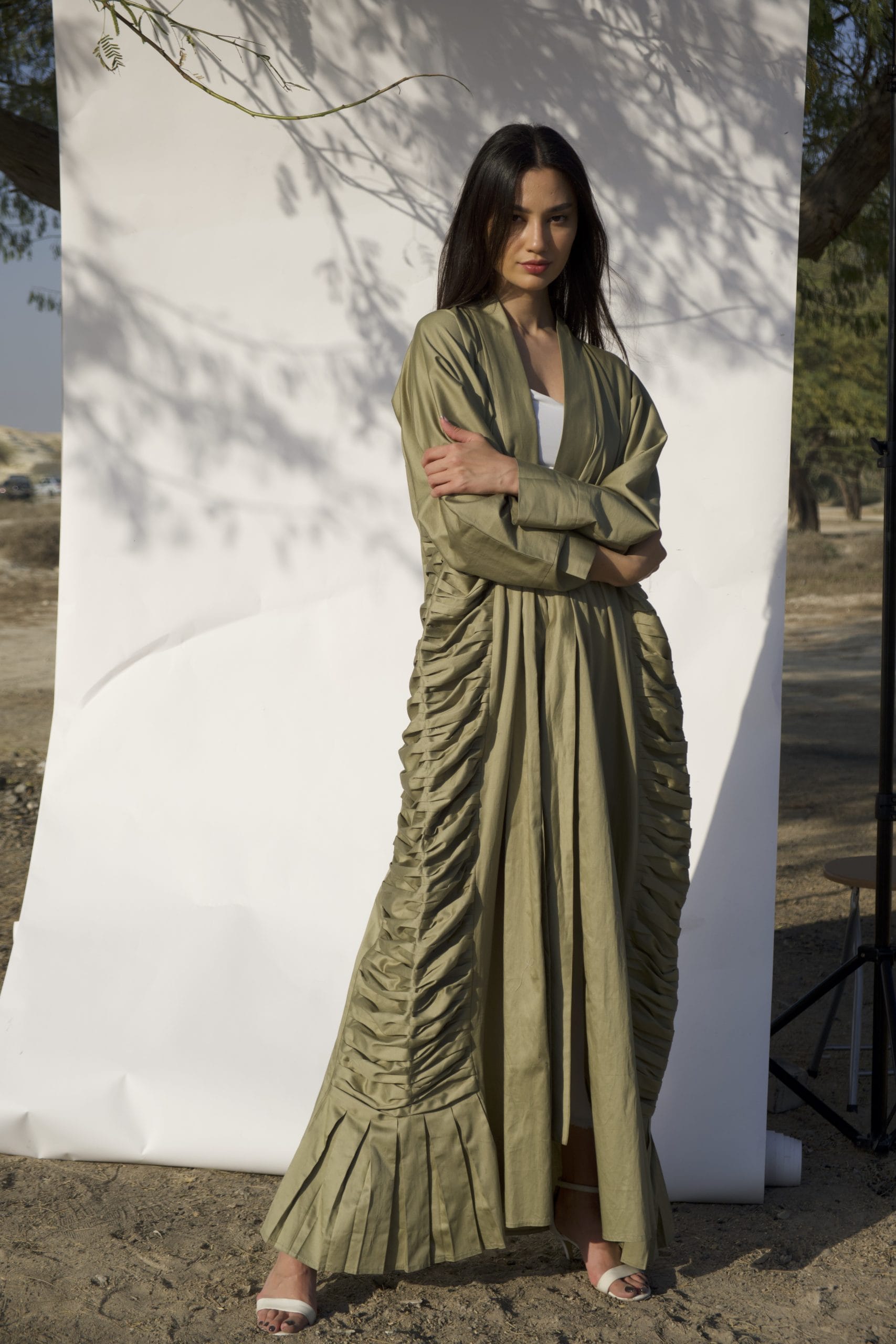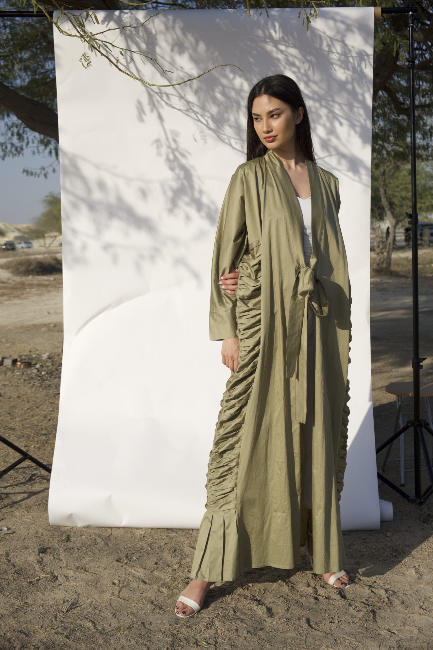 100% cotton mermaid cut abaya in olive with draped details on the sides and adjustable front bow strap. Originally comes with a slightly darker veil color. The model is wearing size Medium.