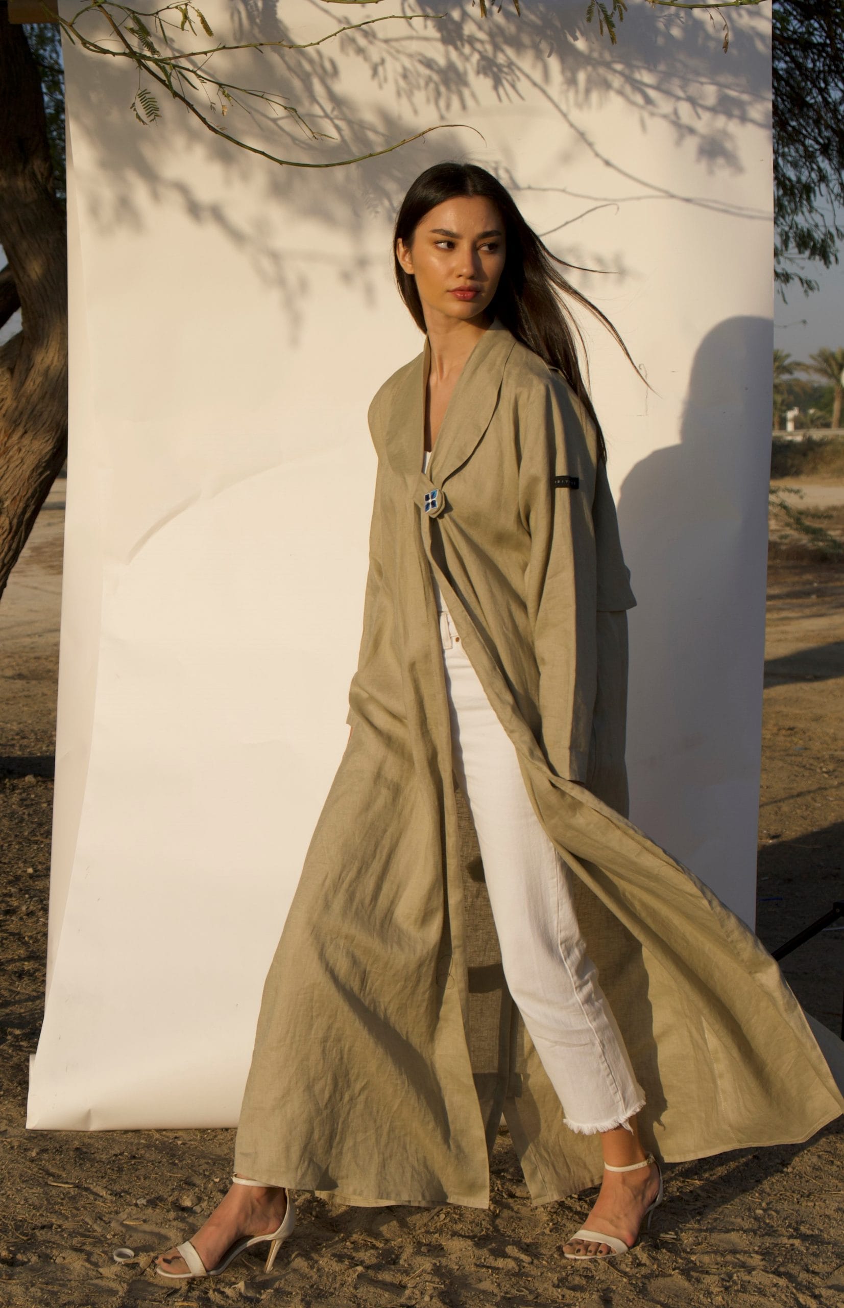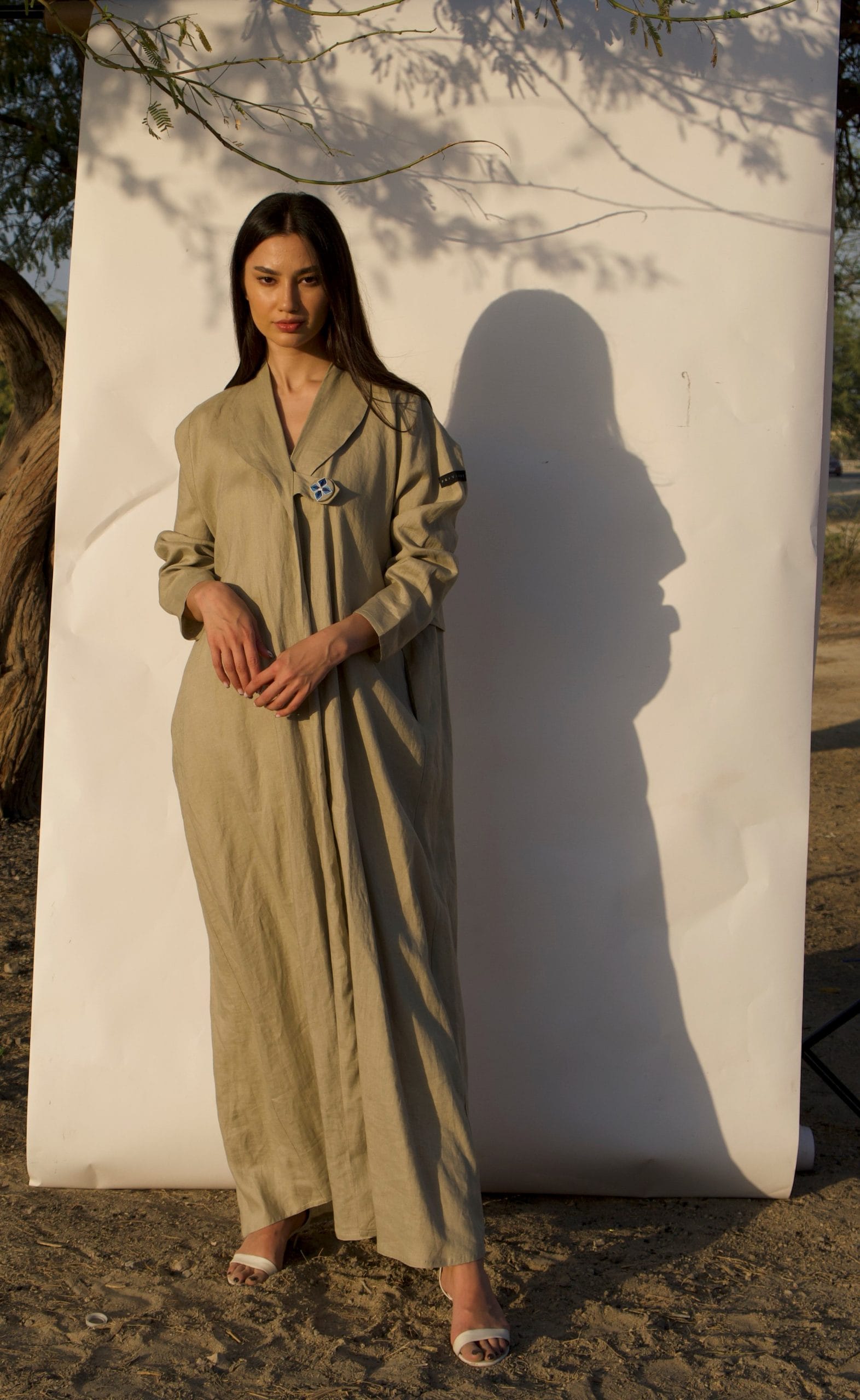 100% pure linen beige trench coat style abaya with handmade graphic floral embroidered buttons in shades of blue. Originally comes with blue or beige veil. The model is wearing size Medium.