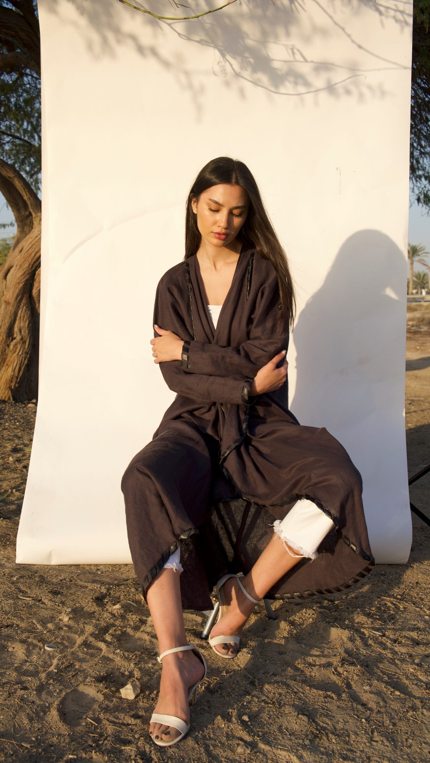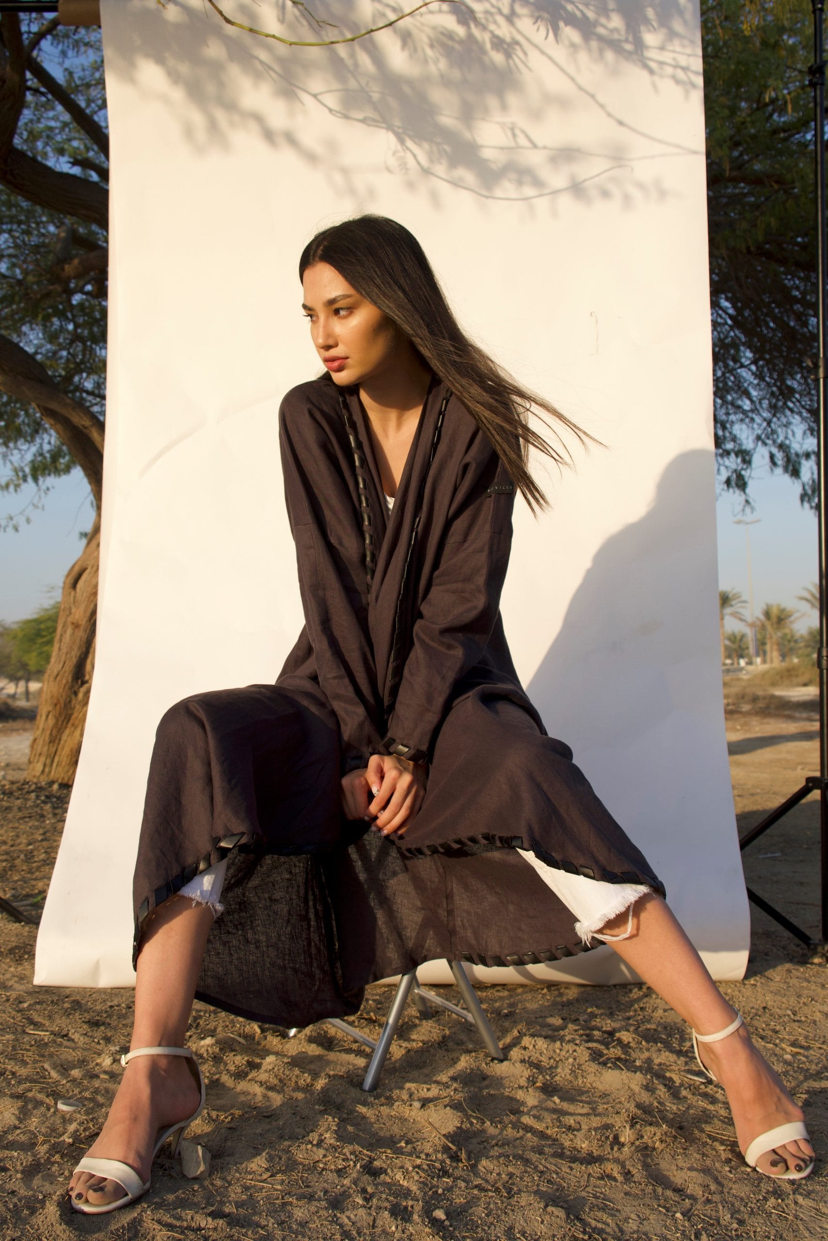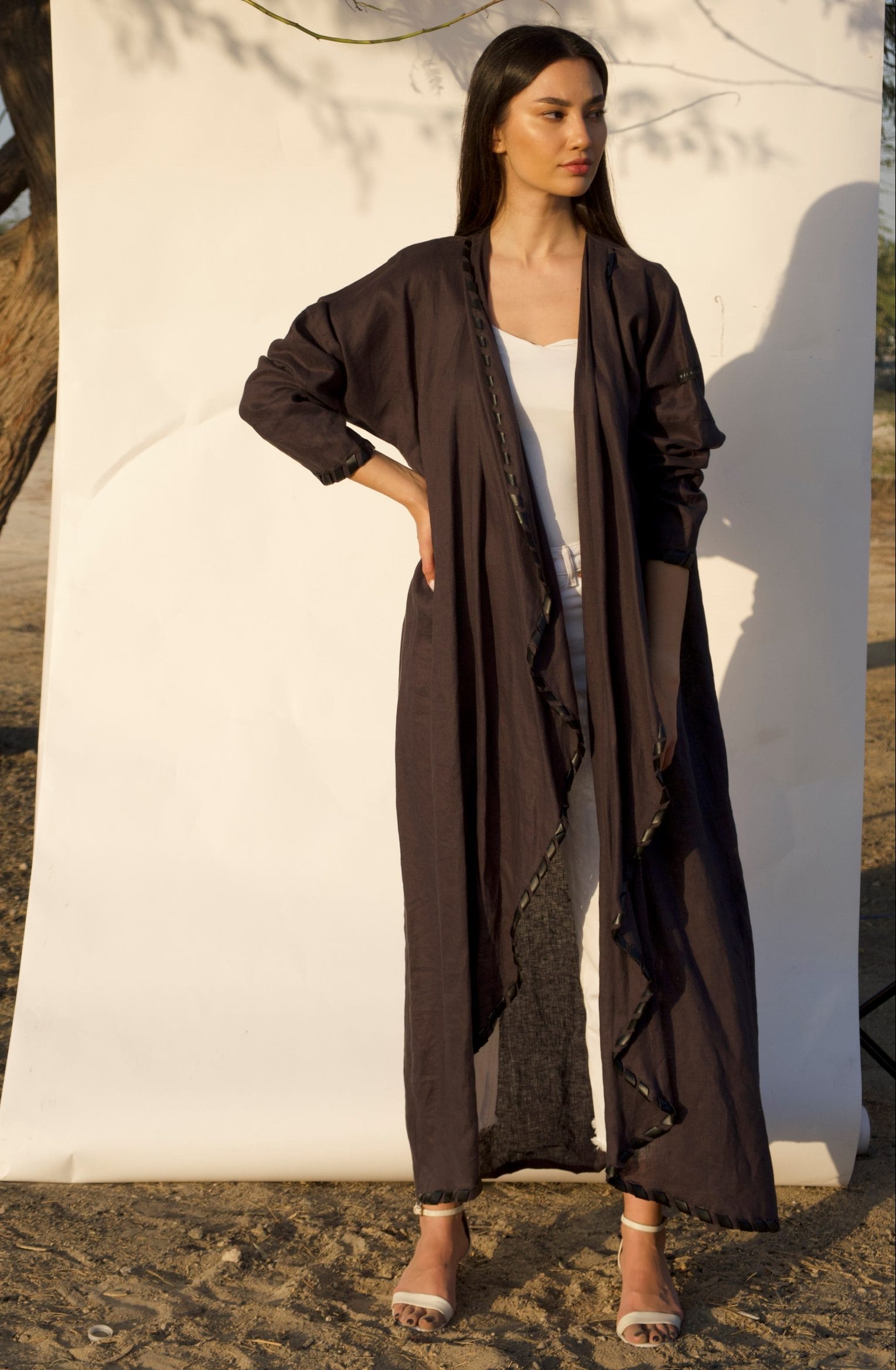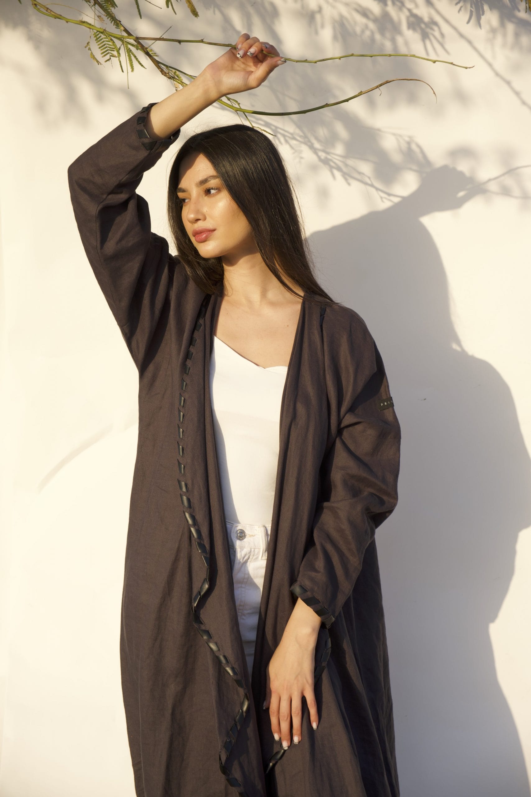 100% pure European linen waterfall abaya with intrecci leather design in charcoal grey. originally comes with charcoal gray veil. The model is wearing size Medium.