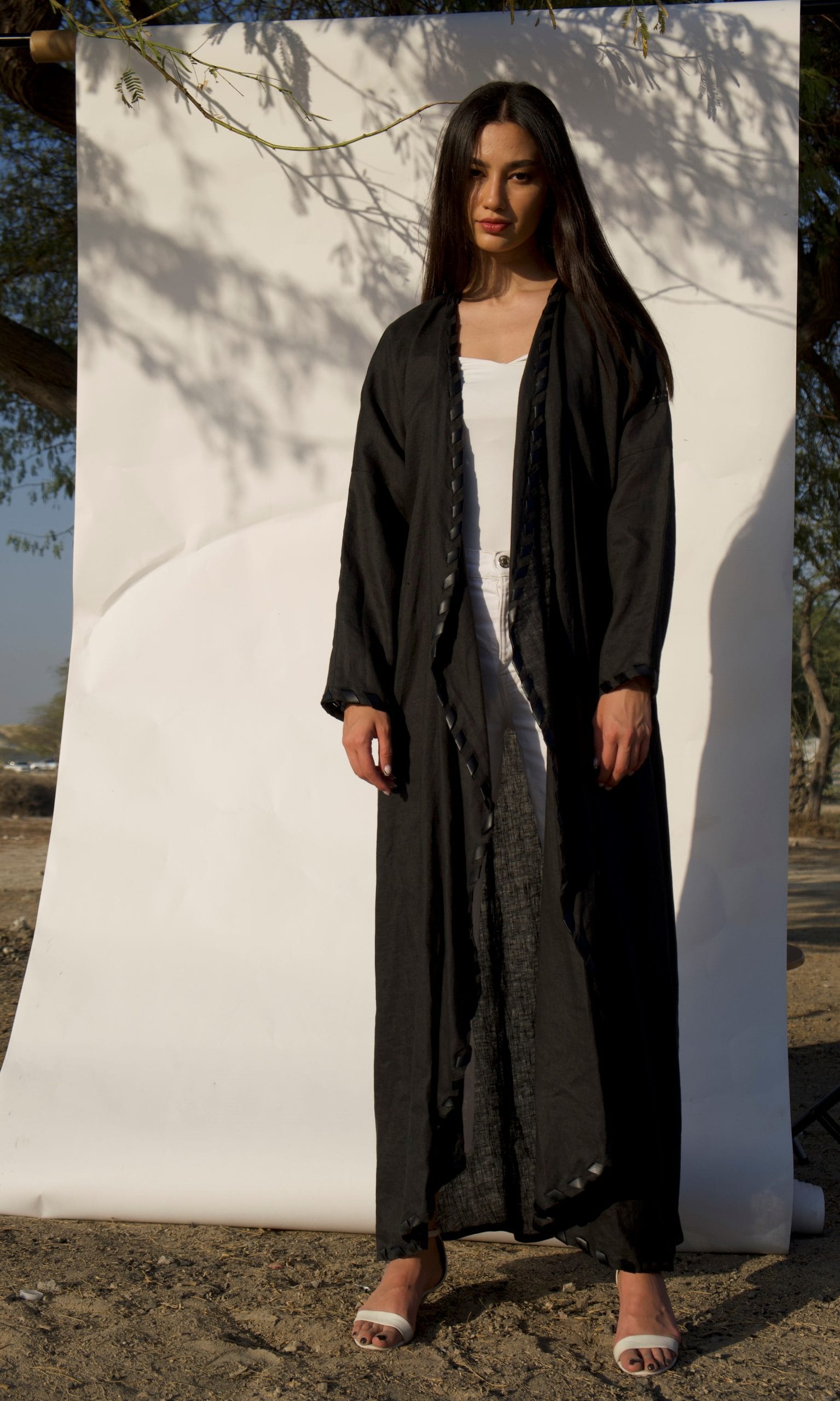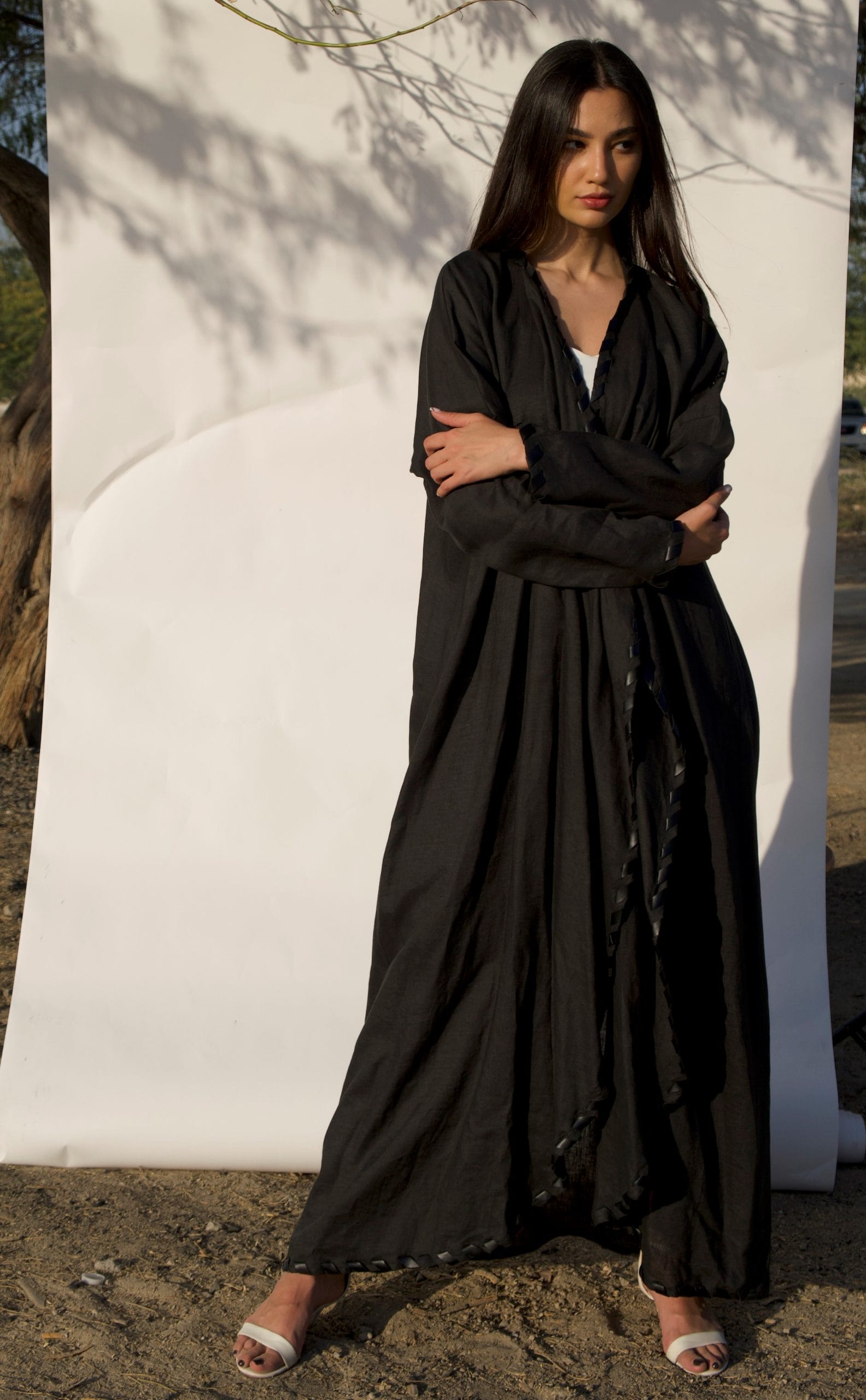 100% pure European linen waterfall abaya with intrecci leather design in black. originally comes with a black veil. The model is wearing size Medium.