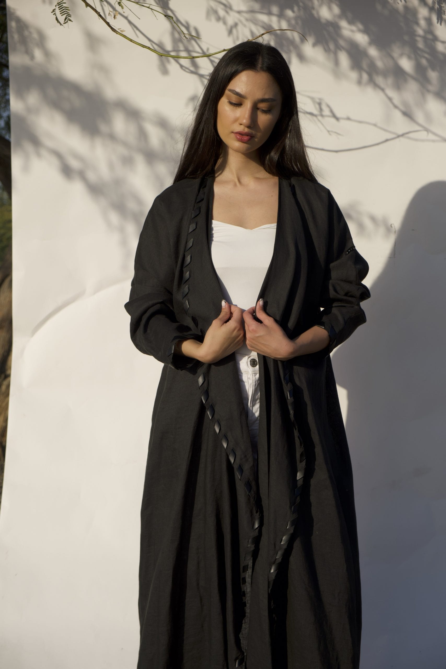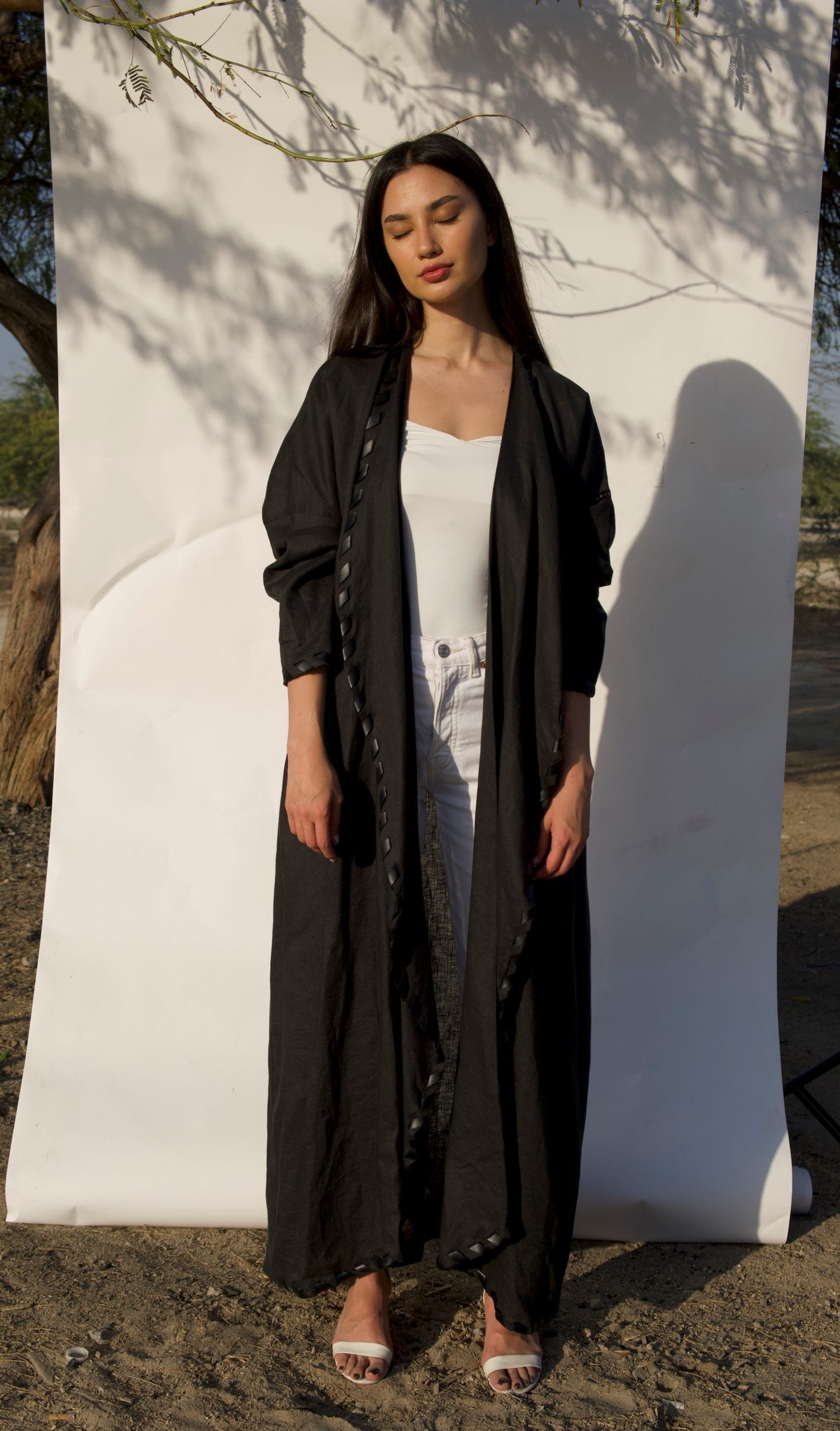 100% pure European linen waterfall abaya with intrecci leather design in black. originally comes with a black veil.