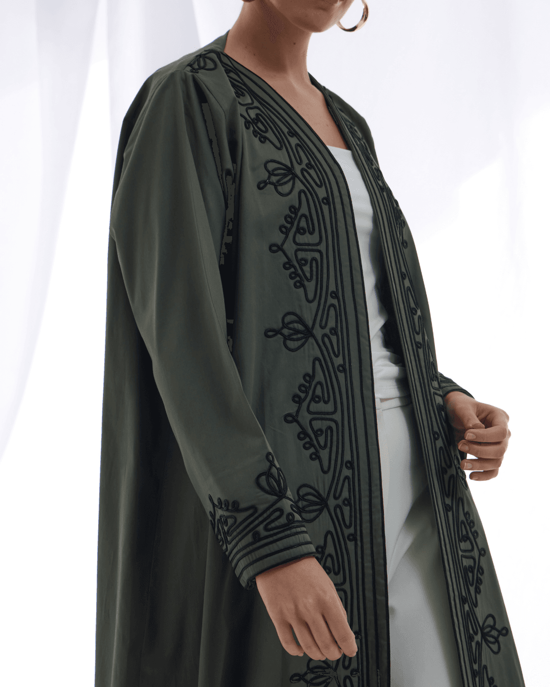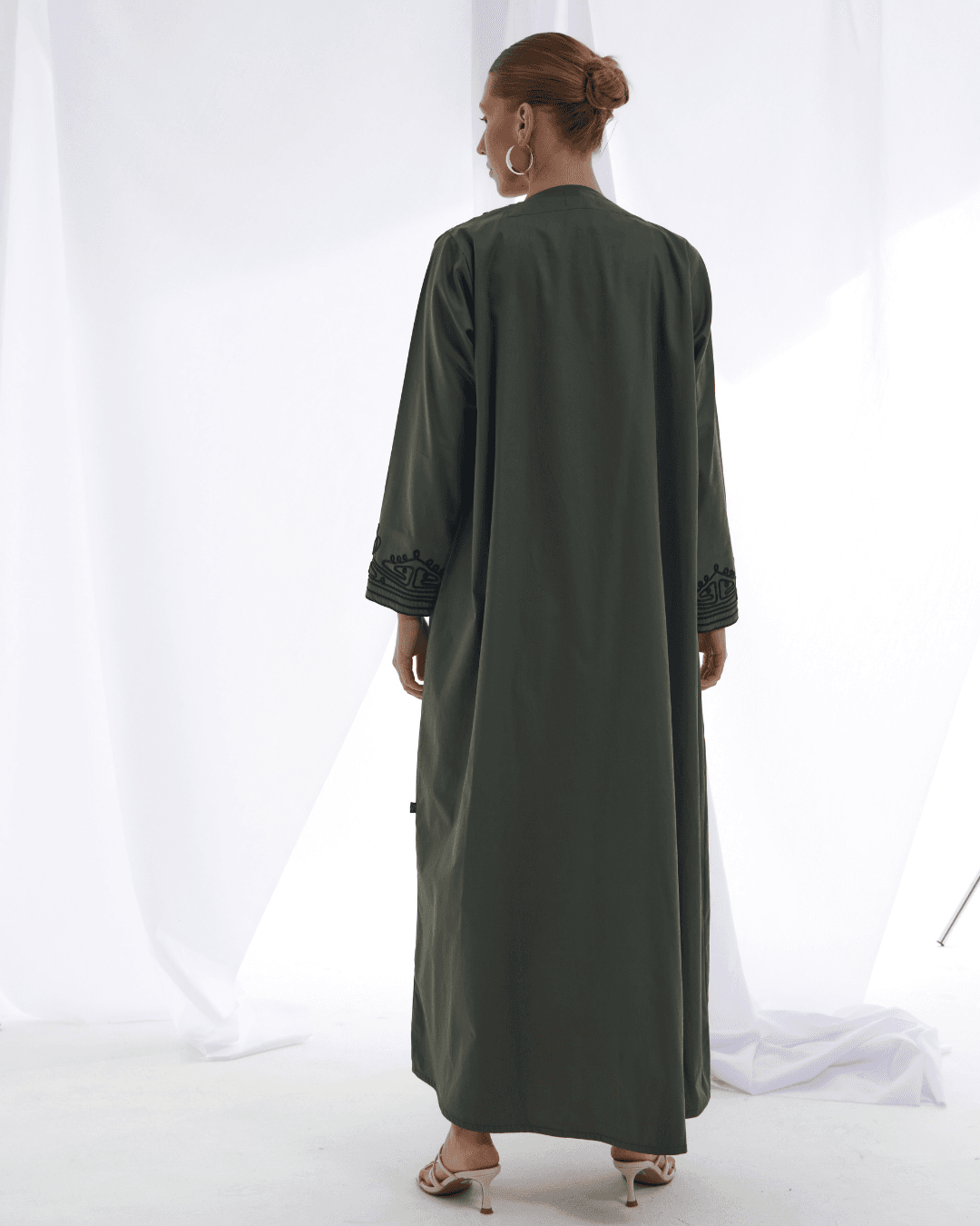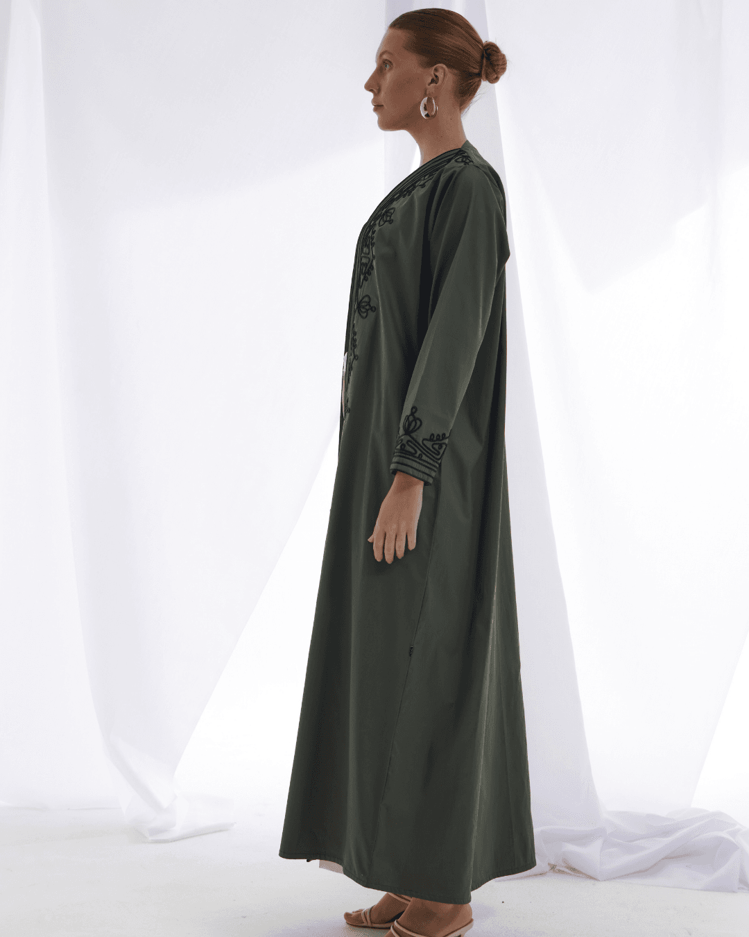 A refined A-Cut Abaya crafted from crisp poplin cotton, elevated with intricate handmade Moroccan embroidery and a sleek, modern finish.