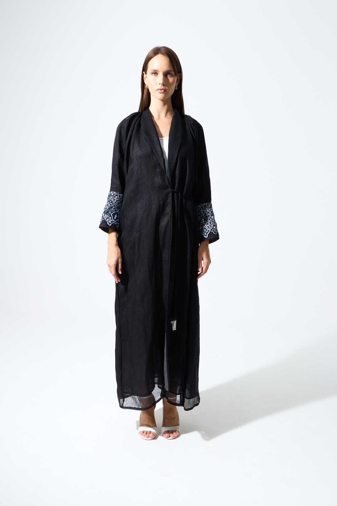 Crafted from airy linen, This wrap Abaya features a flattering design with a floral motif embroidery on the sleeves, and a tie-up tassel pearl belt for a customizable yet chic fit.