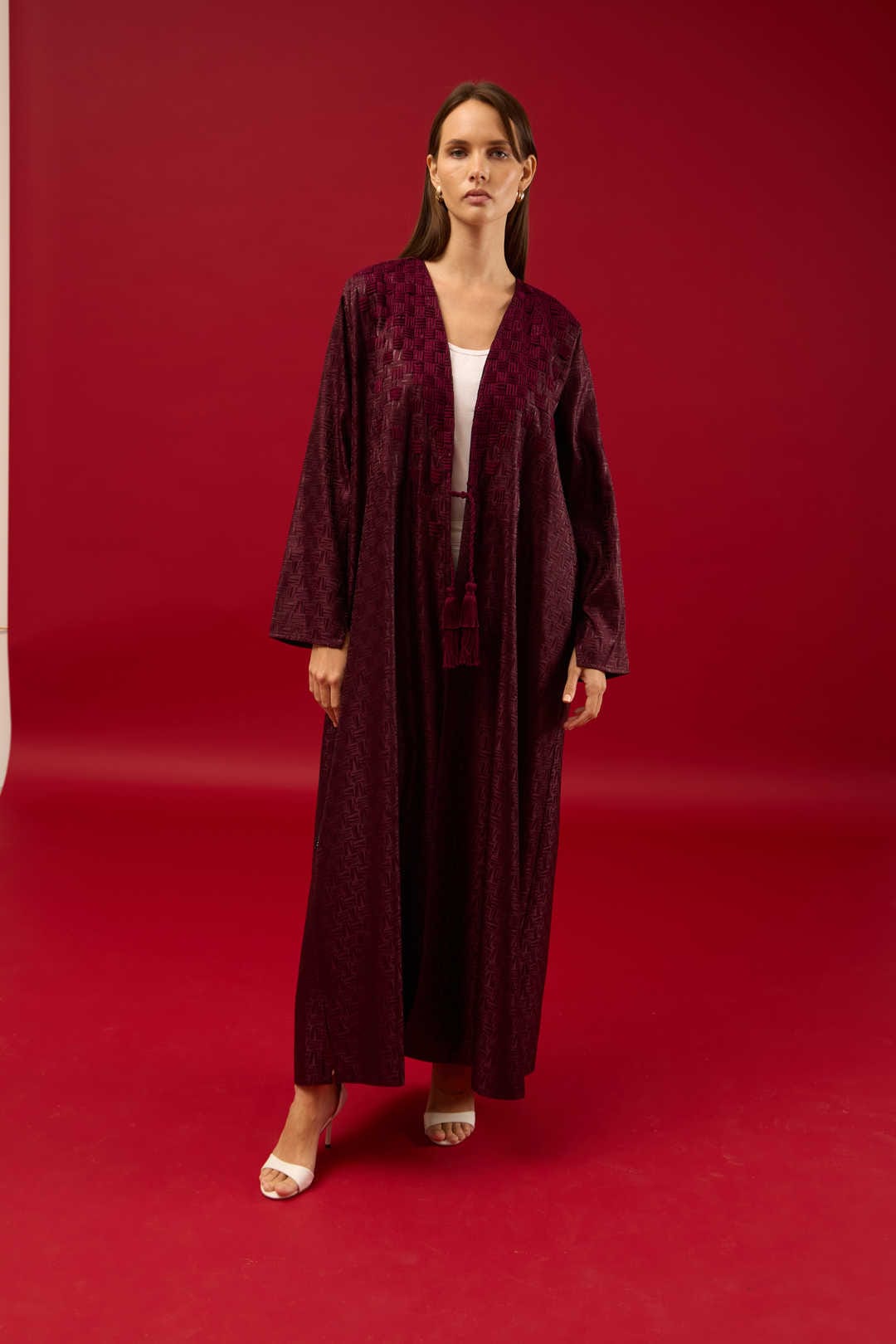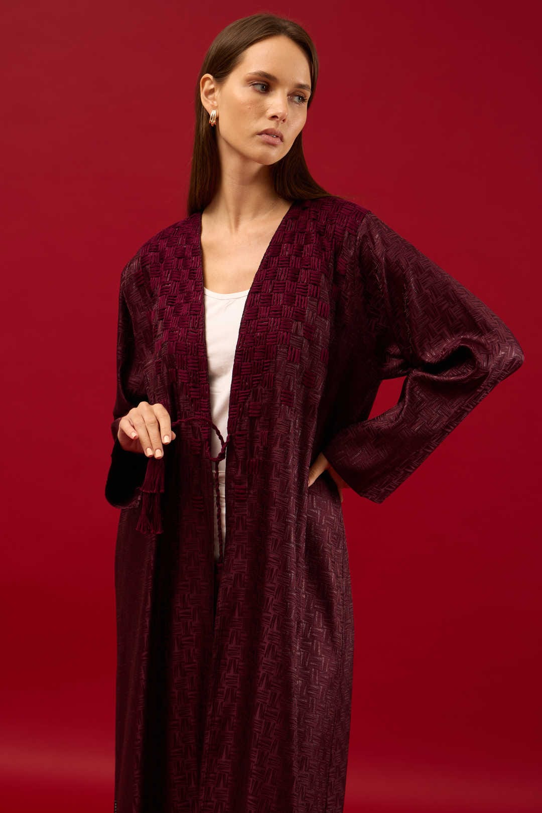 This enveloping straight-cut Abaya is made from two-tone jacquard fabric with textured design of Intreccio-like pattern.