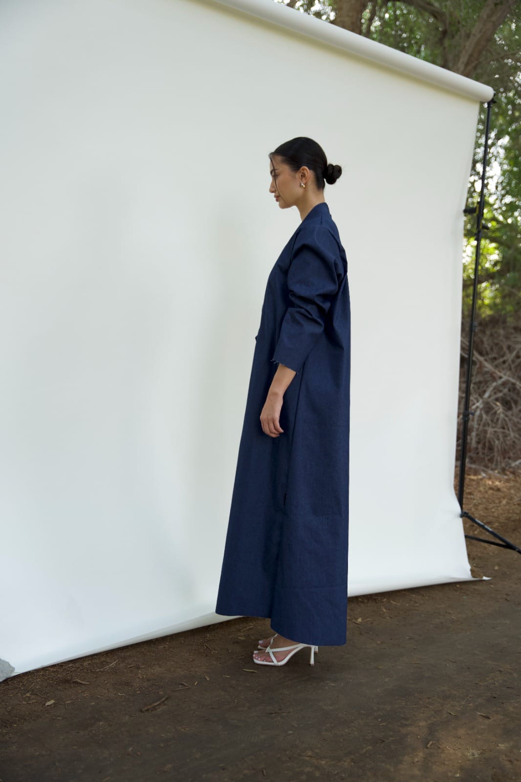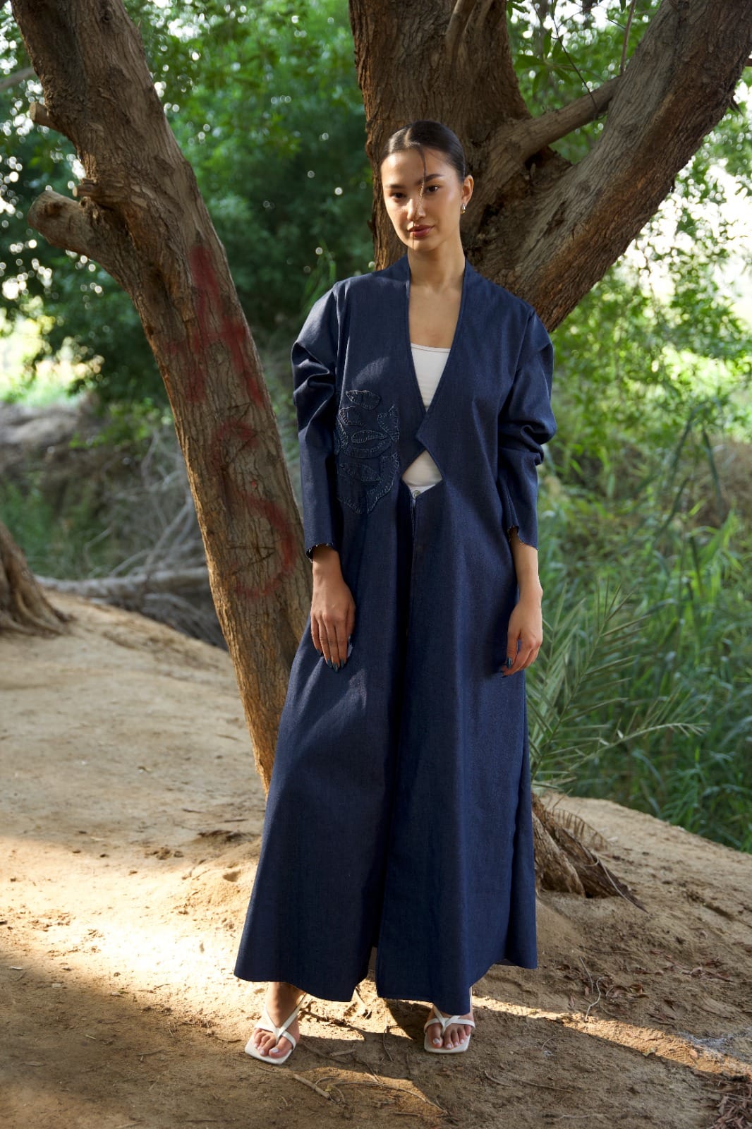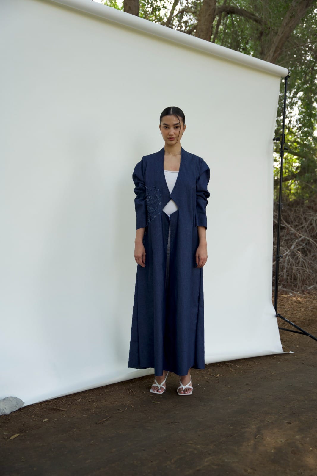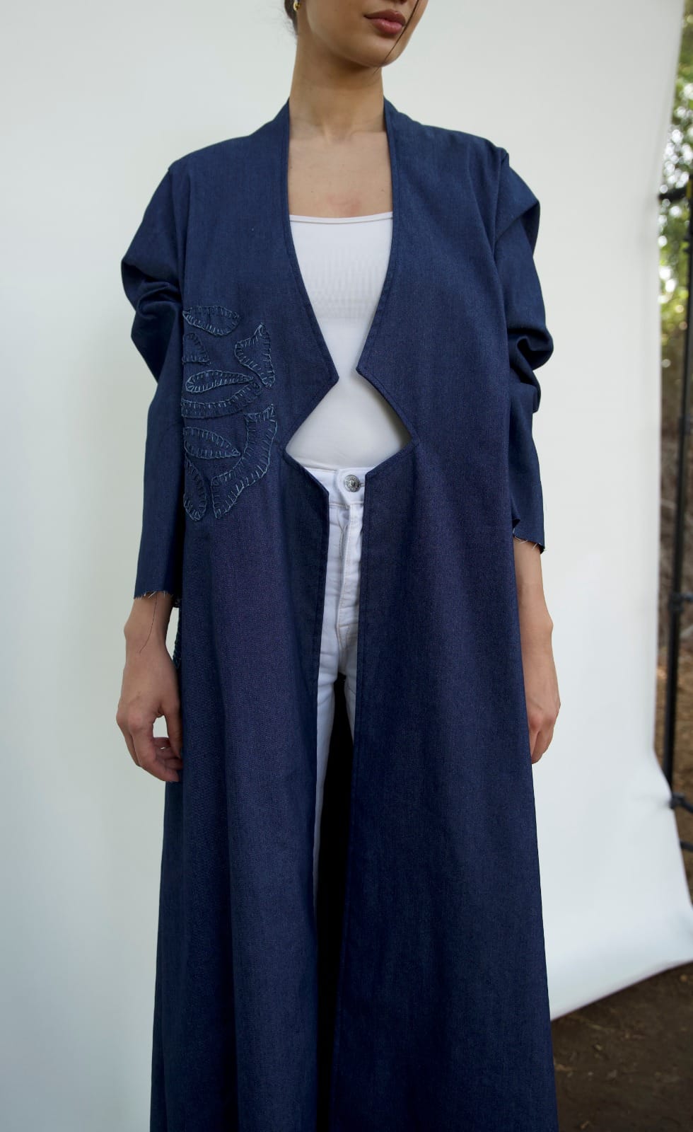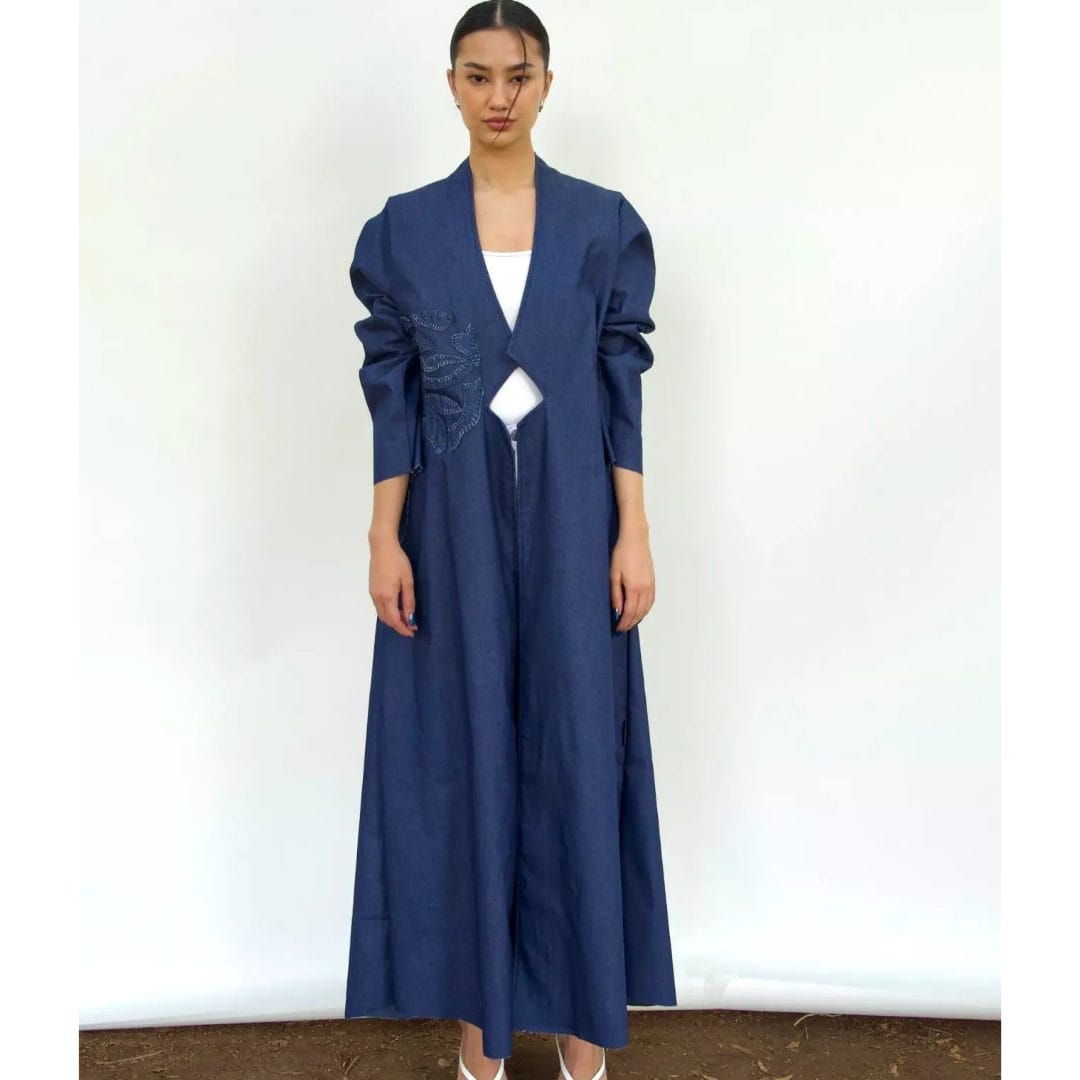 This coat-style Abaya offers a modest take on power dressing, Crafted from Denim, the flared silhouette features a seamless design and Applique floral artwork, adding an intriguing contemporary touch to the garment.