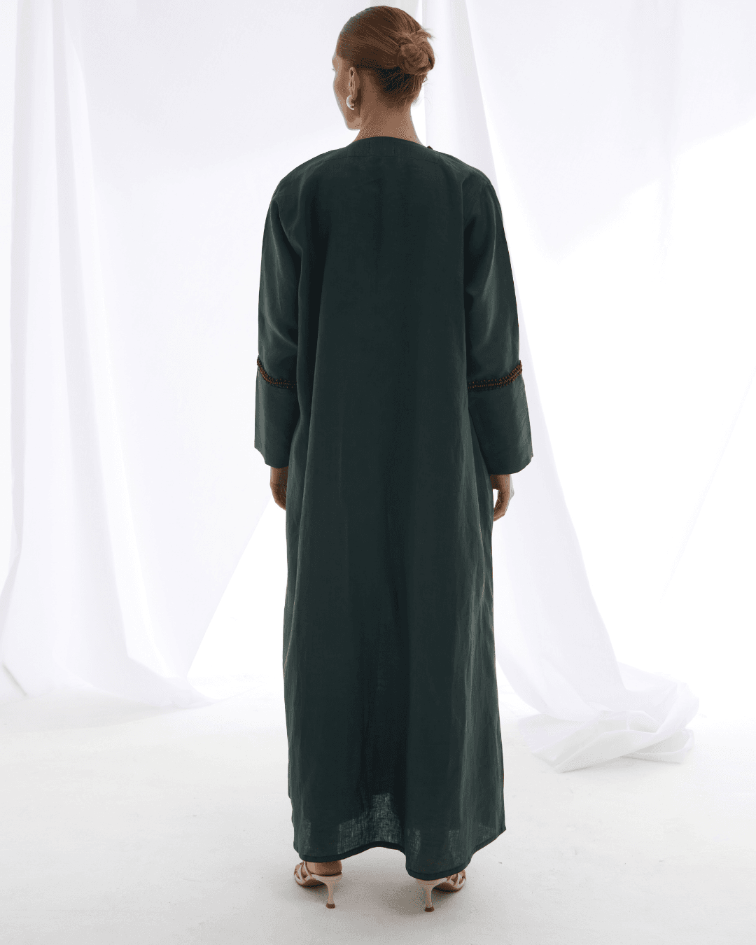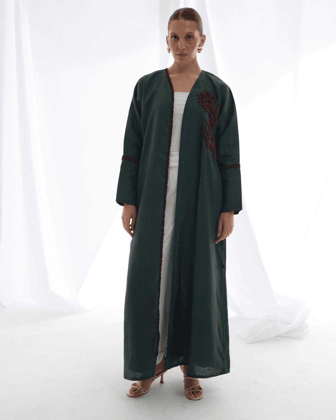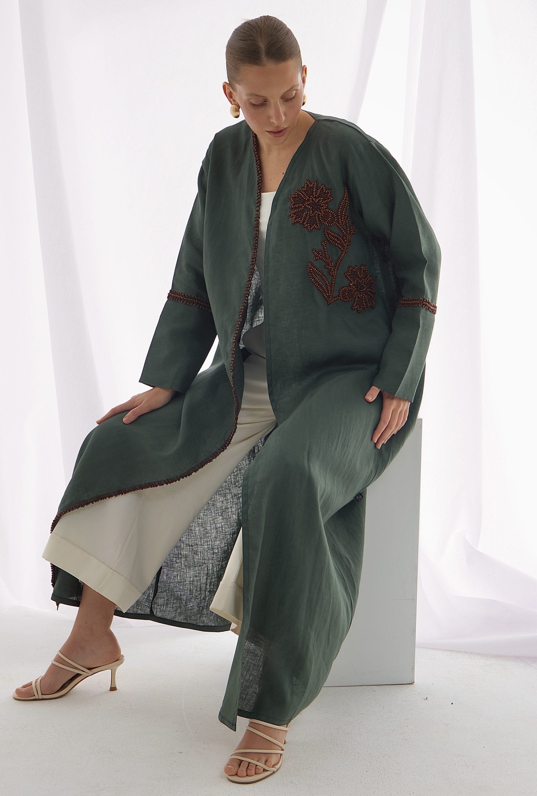 Crafted from pure Belgium linen, this abaya features handmade embroidery adorned with natural wooden beads, each stitch echoing earthy elegance and organic charm. A timeless piece that blends artisanal detail with understated luxury.