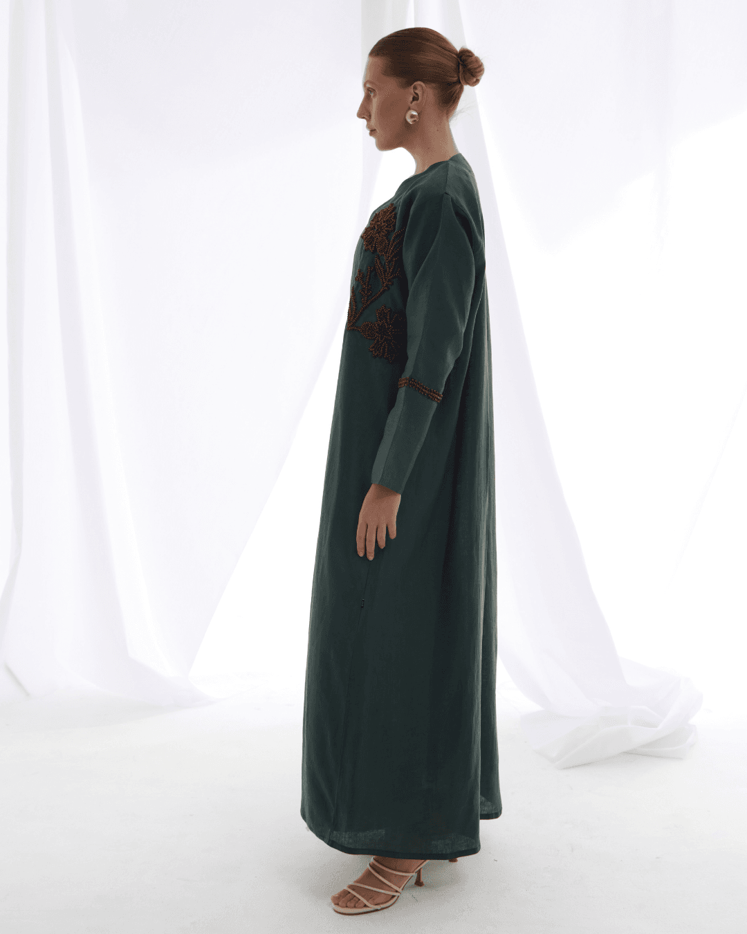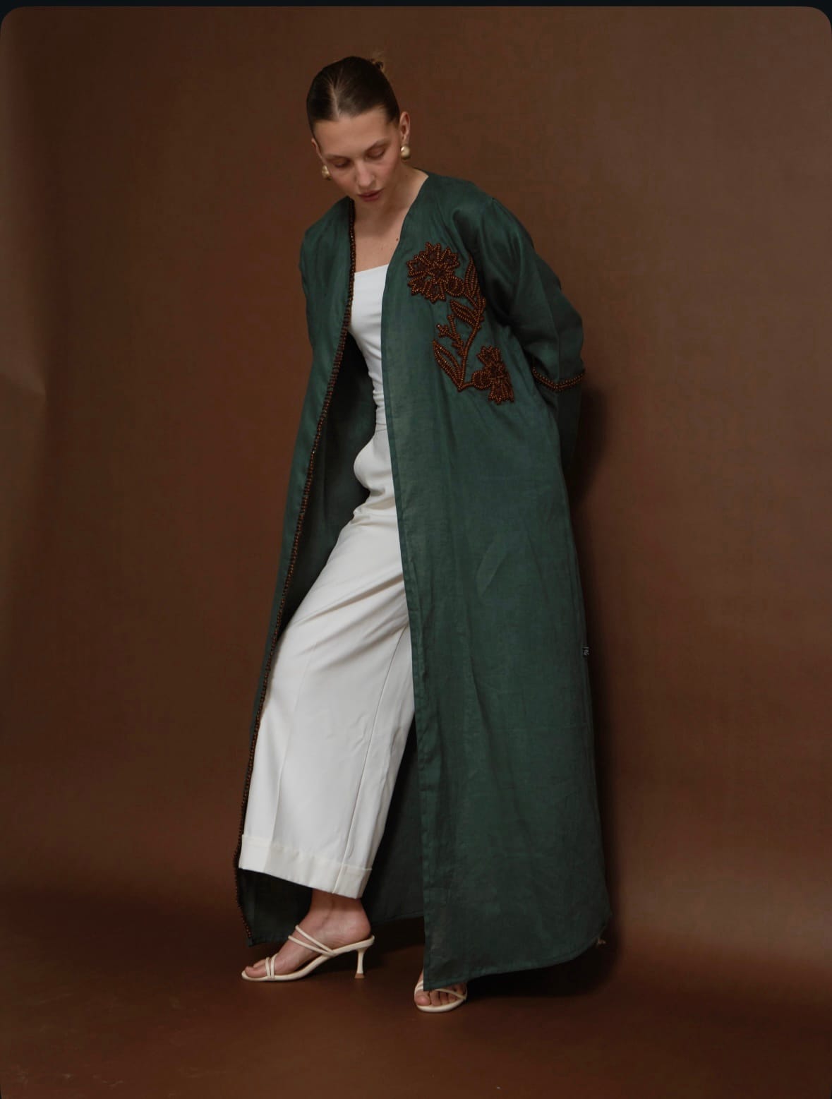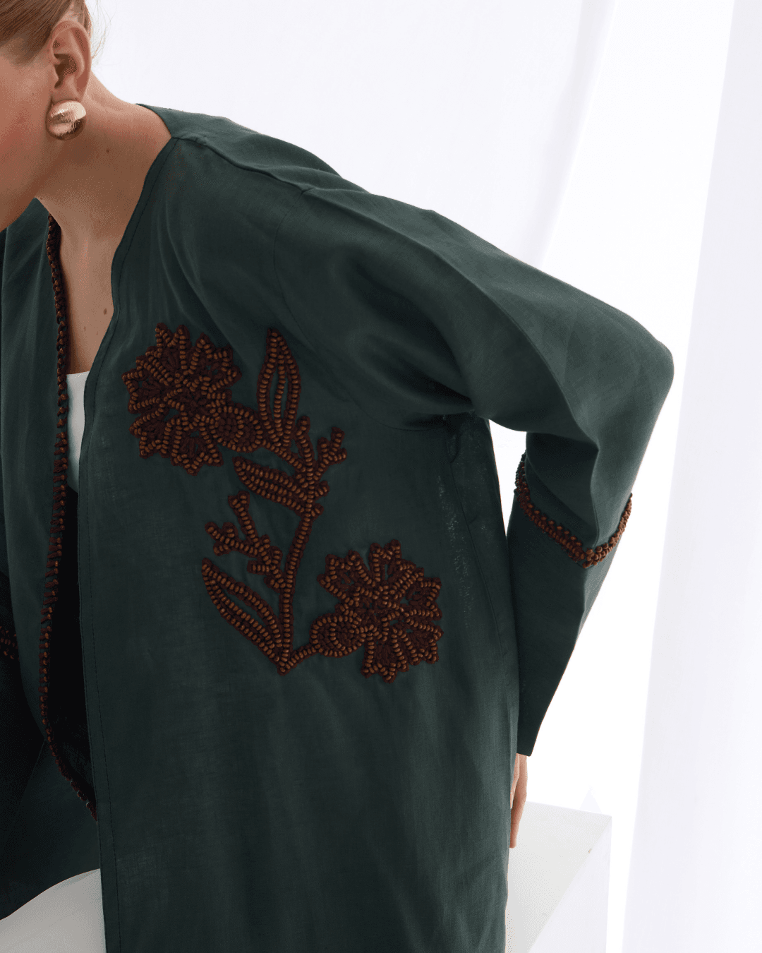 Crafted from pure Belgium linen, this abaya features handmade embroidery adorned with natural wooden beads, each stitch echoing earthy elegance and organic charm. A timeless piece that blends artisanal detail with understated luxury.