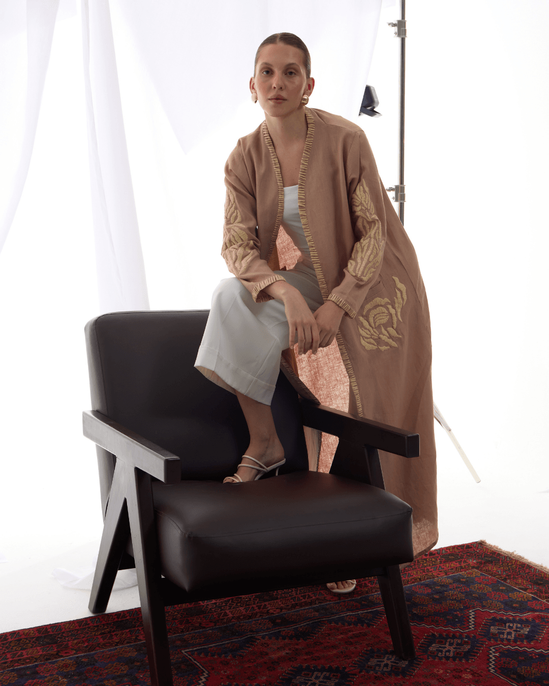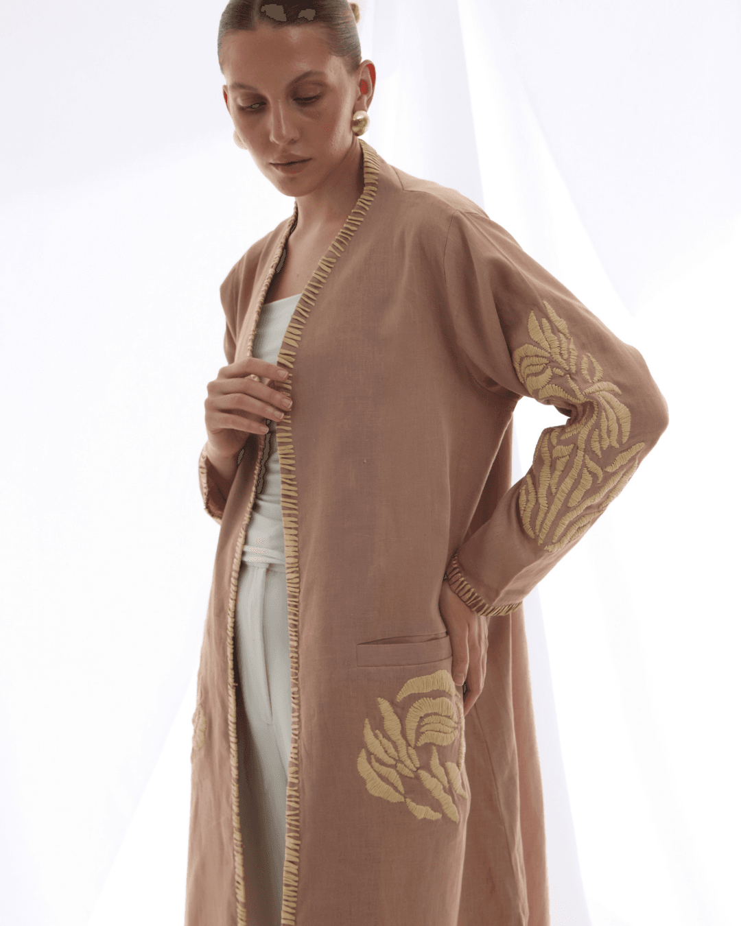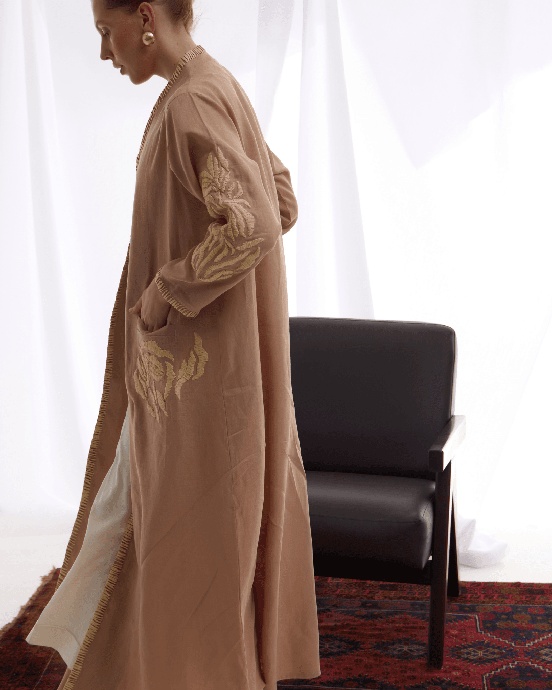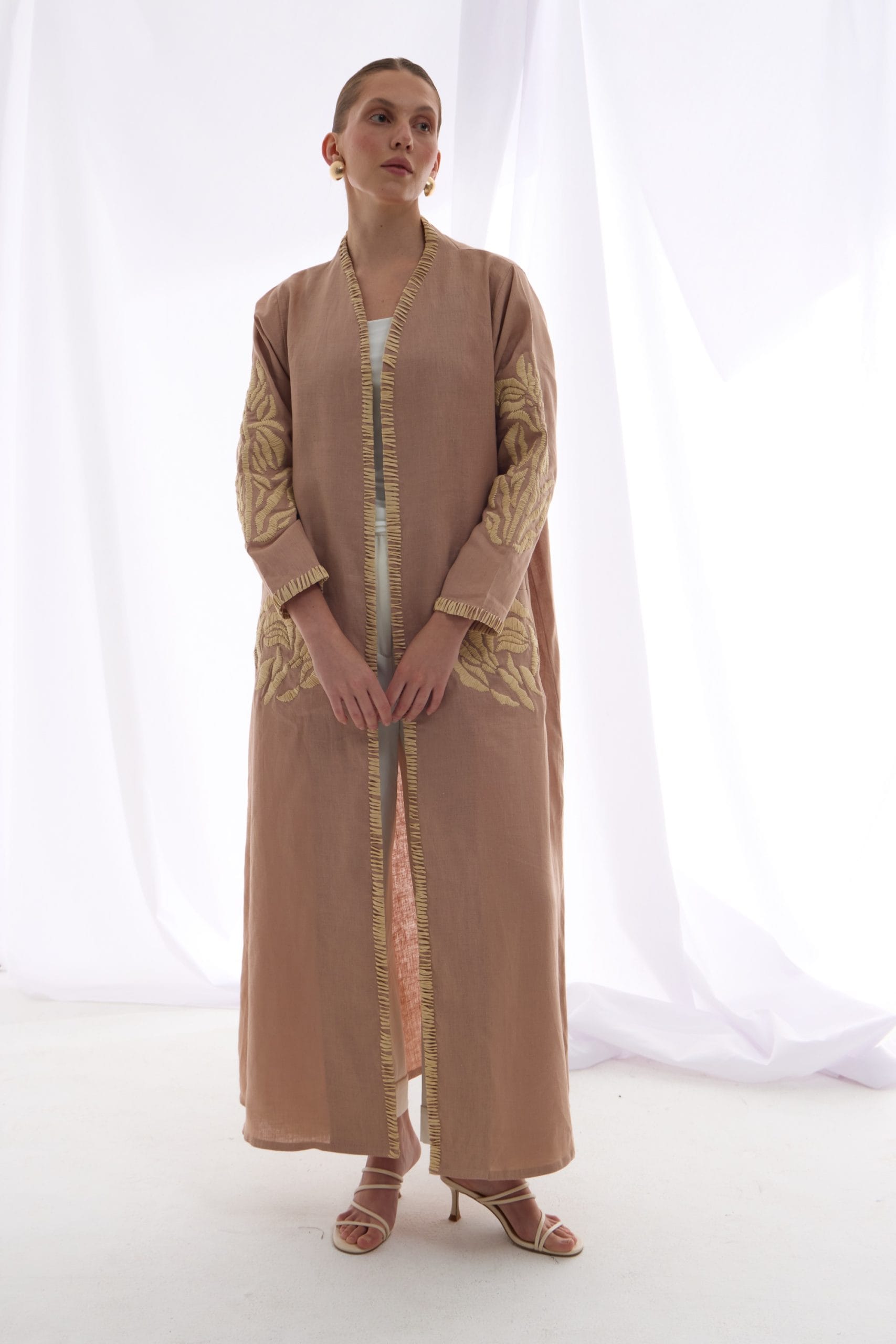 Crafted from original Linen, this Abaya features original Raffia embroidery which showcases the beauty of material that is challenging, as it is unique. Pushing the boundaries of design, we explored creative techniques to transform it into a truly standout piece.