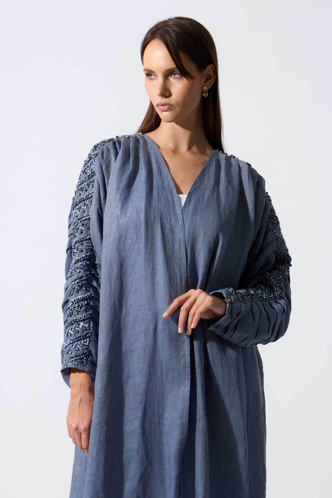 Both sophisticated and dramatic, This Bisht silhouette with pleated sleeves airy linen Abaya is beautifully detailed with two toned hand embroidery along the sleeves making the piece an outstanding outfit on its own.