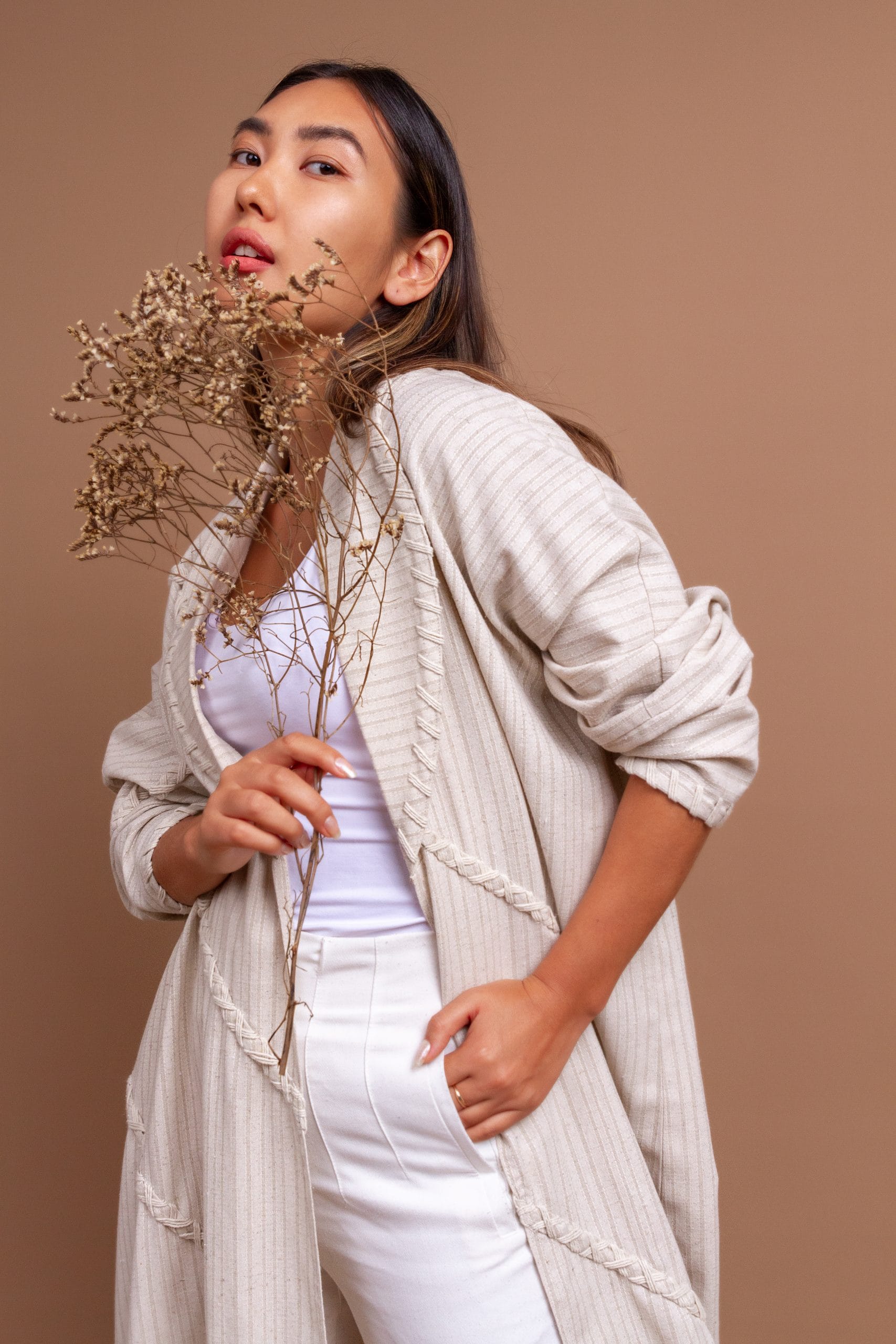 Crafted form premium quality linen, The Dahlia features a Bisht cut silhouette and a round collar neckline. Meanwhile, the Unexpected diagonal lines and crochet details on this Piece is perfect for those who seek style in minimalist ways.